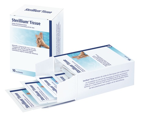 Wasser. Anwendungsgebiete: Zur hygienischen Händedesinfektion, zur Hautdesinfektion vor Injektionen und Punktionen auf talgdrüsenarmer Haut. Gegenanzeigen: Sterillium Tissue darf nicht angewendet werden, wenn eine Überempfindlichkeit (Allergie) gegen 2-Propanol (Ph. Eur.), 1-Propanol (Ph. Eur.), Mecetroniumetilsulfat oder einen der sonstigen Bestandteile besteht, in der unmittelbaren Nähe der Augen oder offener Wunden, bei Früh- und Neugeborenen, zur Desinfektion von Schleimhäuten. Nebenwirkungen: Gelegentlich kann eine leichte Trockenheit oder Reizung der Haut auftreten. In solchen Fällen wird empfohlen, die allgemeine Hautpflege zu intensivieren. Allergische Reaktionen sind selten. Warnhinweise: Anwendung bei Säuglingen und Kleinkindern erst nach ärztlicher Rücksprache. Berührung mit den Augen vermeiden. Bei Berührung mit den Augen sofort bei geöffnetem Lidspalt mehrere Minuten mit fließendem Wasser spülen. Elektrische Geräte erst verwenden, wenn das Mittel getrocknet ist. Von offenen Flammen fernhalten. Nicht in der Nähe von Zündquellen verwenden.