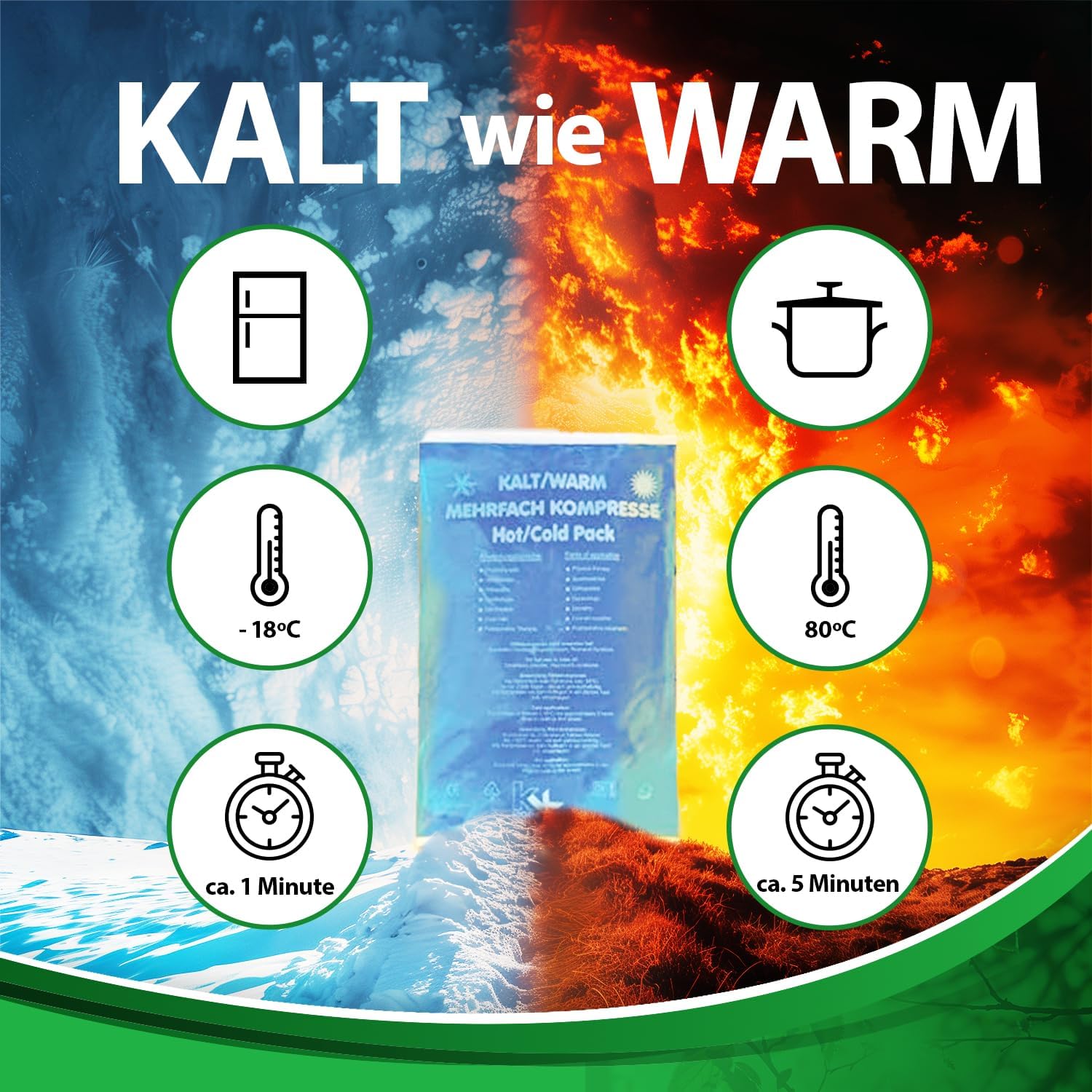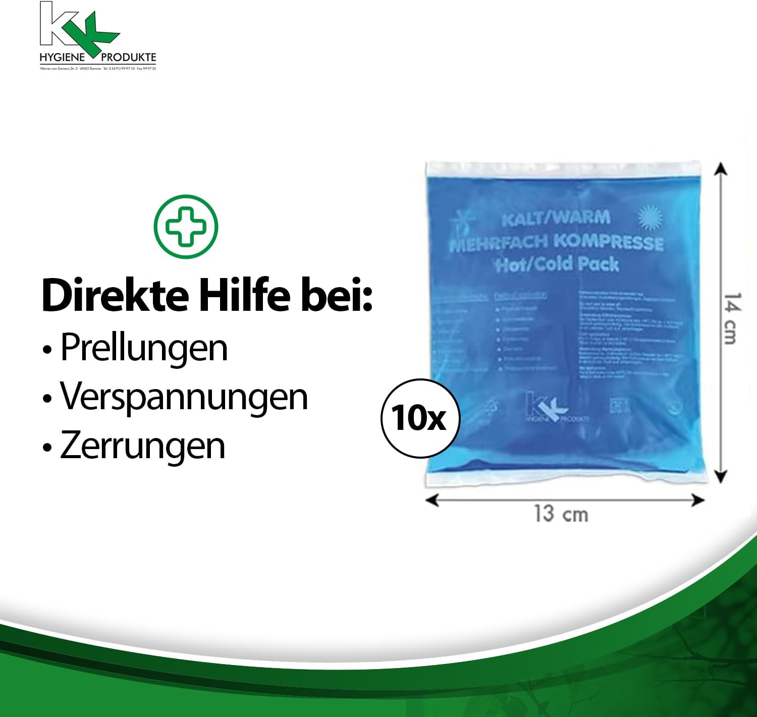 Die Kalt-Warm-Kompressen und Kältesofortkompressen können schnelle Hilfe bei Prellungen, Verstauchungen, bei Gelenkschmerzen, Fieber, Zahnschmerzen, Insektenstichen, nach Operationen und Blutergüssen bieten ! Die Kompressen sind sehr praktisch zum Mitnehmen auf Ausflügen oder Sportaktivitäten. Sie können sowohl zur Kälte- (Kühlschrank oder Truhe) als auch zur Wärmebehandlung (Mikrowelle) angewendet werden.
