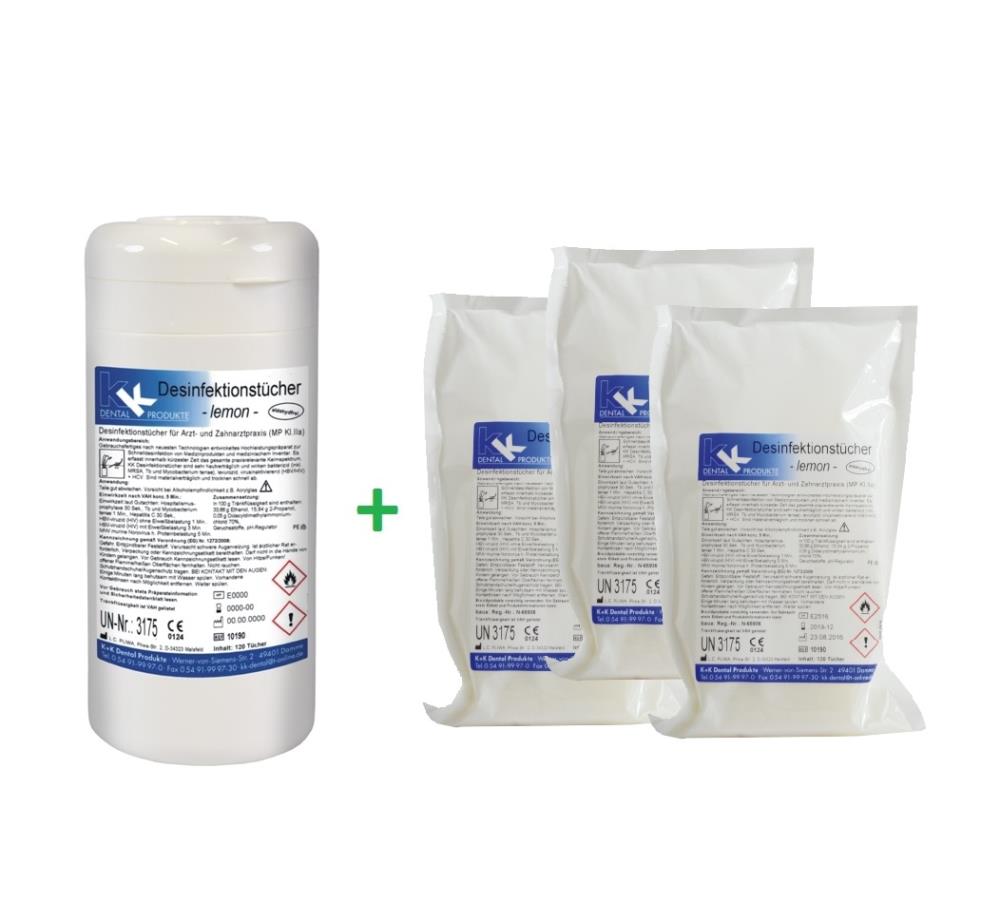 KK Desinfektionstücher | 1 Dose mit 120 Tücher + 3 Nachfüllbeutel mit 120 Tücher